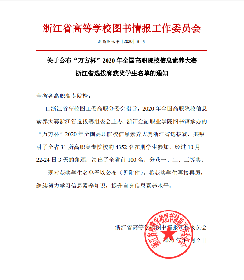 为了贯彻落实《国家职业教育改革实施方案》及《教育信息化2.0行动计划》的文件精神,根据《普通高校图书馆规程》关于“图书馆应重视开展信息素质教育”的要求,以全国高职院校信息素养大赛为载体,以赛促教、以赛促学、以赛促练,提高我省高职师生信息素养能力,浙江省高校图工委高职分委会指导,2020年全国高职院校信息素养大赛浙江省选拔赛组委会主办,浙江金融职业技术学院承办“万方杯”2020年全国高职院校信息素养大赛浙江省选拔赛。