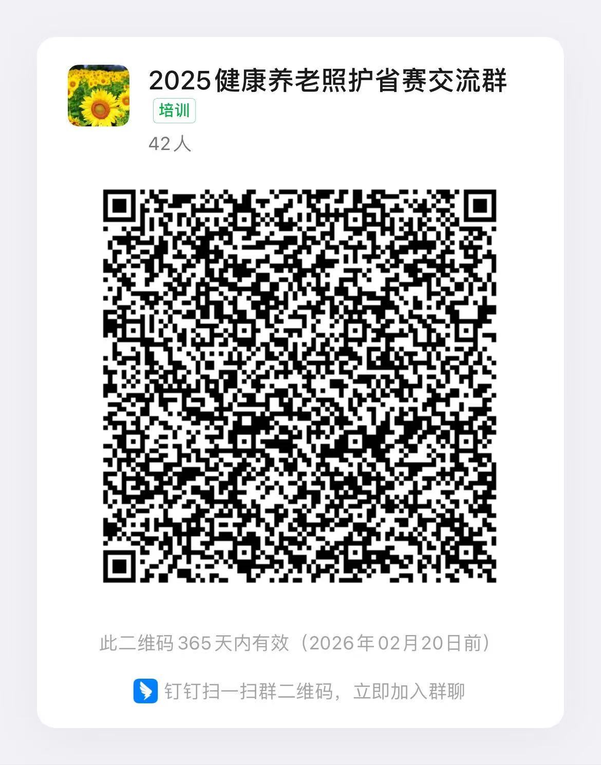 参赛院校领队请钉钉扫码加入2025健康养老照护省赛交流群,加群后请以“学校+姓名”备注。